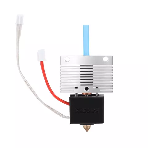 Хотенд в полностью собранном состоянии, готов к работе. В комплекте: PTFE-трубка, радиатор, термобарьер, нагревательный блок и элемент, термистор, сопло, силиконовая накладка.
