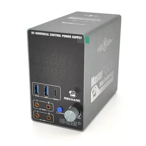 Лабораторний блок живлення Mechanic DC-2405+ — це точне джерело постійного струму, створене для ремонту та тестування електронних пристроїв. Оснащений LED-дисплеєм для відображення фактичних значень напруги, струму та потужності в режимі реального часу, а цифрове регулювання забезпечує високу точність роботи. Підтримує стандарти швидкого заряджання PD3.1 та QC3.0, тому може використовуватися як універсальна станція живлення для портативної техніки. Завдяки двом DC-виходам і USB-порту підходить для одночасного живлення кількох пристроїв. Має захист від перевантаження й короткого замикання — надійне рішення для майстерень, лабораторій і сервісних центрів.
