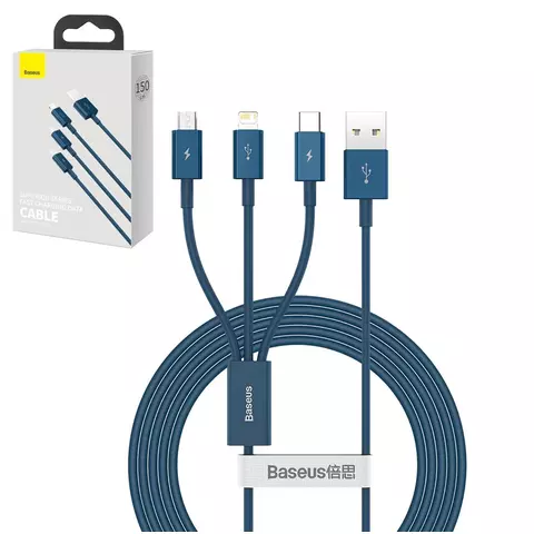USB кабель Baseus Superior, USB тип-C, USB тип-A, micro-USB тип-B, Lightning, 150 см, 3,5 А, синий, силиконовый, 3 в 1, #CAMLTYS-03