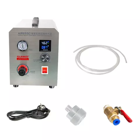 Компресор повітряний SUNKKO AIR 2550 — безмасляний компресор, призначений для стабільного подавання повітря під час точкового зварювання, фарбування, ремонту та інших технічних робіт. Оснащений смартсистемою керування, цифровим дисплеєм і працює з мінімальним рівнем шуму.