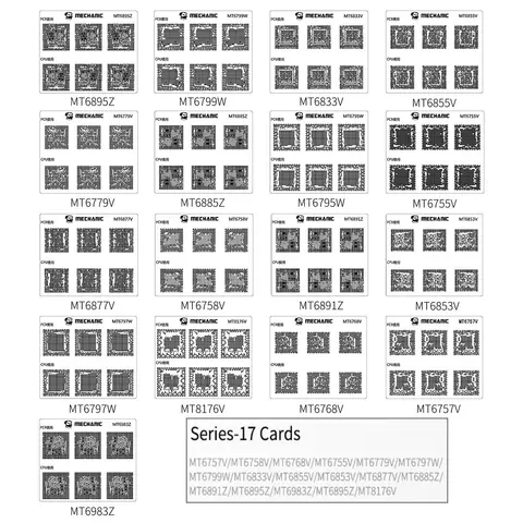 BGA-трафарет Mechanic COM80-17 — професійний набір із 17 металевих шаблонів, призначених для ремонту та відновлення відпаяних контактів мікросхем мобільних пристроїв. Набір розроблений спеціально для роботи з материнськими платами серії MT6757V, MT6758V, MT6768V, MT6755V, MT6779V, MT6797W, MT6799W, MT6833V, MT6855V, MT6853V, MT6877V, MT6885Z, MT6891Z, MT6895Z, MT6983Z, MT6895Z, MT8176V. Трафарети виготовлені з міцної нержавіючої сталі, стійкої до деформацій та високих температур, що забезпечує багаторазове використання та точне відновлення BGA-контактів.