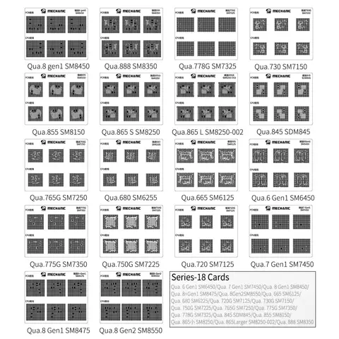BGA-трафарет Mechanic COM80-18 — професійний набір із 18 металевих шаблонів, призначених для ремонту та відновлення відпаяних контактів мікросхем мобільних пристроїв. Набір розроблений спеціально для роботи з материнськими платами серії Qua. 6 Gen1 SM6450, Qua. 7 Gen1 SM7450, Qua. 8 Gen1 SM8450, Qua. 8+ Gen1 SM8475, Qua. 8 Gen2 SM8550, Qua. 665 SM6125, Qua. 680 SM6225, Qua. 720G SM7125, Qua. 730G SM7150, Qua. 750G SM7225, Qua. 765G SM7250, Qua. 775G SM7350, Qua. 778G SM7325, Qua. 845 SDM845, Qua. 855 SM8150, Qua. 865 SM8250, Qua. 865 Larger SM8250-002, Qua. 888 SM8350. Трафарети виготовлені з міцної нержавіючої сталі, стійкої до деформацій та високих температур, що забезпечує багаторазове використання та точне відновлення BGA-контактів.