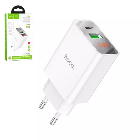 Мережевий зарядний пристрій Hoco C100A, 20 Вт, Quick Charge, Power Delivery (PD), білий, з дисплеєм, 2 порта, #6931474769800