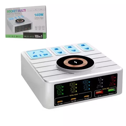Мережевий зарядний пристрій Kingmax WLX-H13, 140 Вт, Wireless Charge, Quick Charge, Power Delivery (PD), з розеткою, 5 портів, 10 in 1
