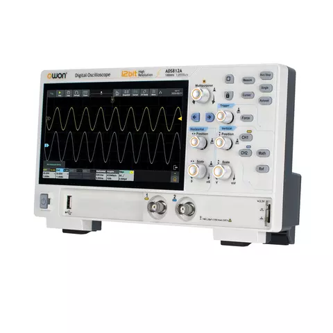 OWON ADS812A – це двоканальний цифровий осцилограф зі смугою пропускання 100 МГц, максимальною частотою дискретизації 1,25 Гвиб/с та швидкістю захоплення осцилограм 700 000 осц/с. Також прилад оснащений вбудованим частотоміром, вольтметром та аналізатором спектра ШПФ.