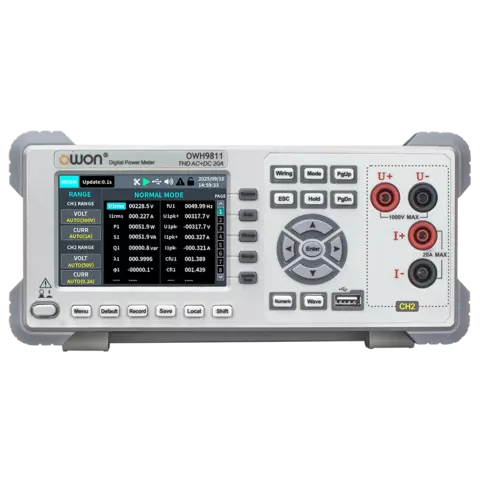 OWON OWH9811 – це двоканальний вимірювач потужності. Задня панель (CH1) використовується як основний вхід змінного струму та призначена для вимірювання однофазних AC-сигналів з напругою до 600 В та струмом до 20 А (RMS). Передня панель (CH2) підтримує вимірювання змінного і постійного струму (AC/DC), не має функції гармонійного аналізу та оптимізована для роботи з DC-сигналами, розширюючи діапазон вимірювання до 1000 В / 20 А. Завдяки двоканальній архітектурі прилад дозволяє вимірювати такі параметри, як напруга, струм, потужність інтегральні значення та ефективність.