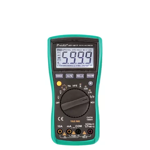 Pro'sKit MT-1217 – це цифровий 3 5/6-розрядний True RMS мультиметр, оснащений РК-дисплеєм з висотою тексту 20 мм. Модель вирізняється чіткістю показань, стабільною роботою та високою надійністю. Мультиметр призначений для вимірювання постійної та змінної напруги, постійного та змінного струму, опору, ємності, частоти/коефіцієнта заповнення, безконтактного визначення напруги, перевірки діодів та провідності кола.