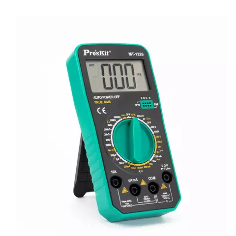 Pro'sKit MT-1226 – це високонадійний цифровий мультиметр з живленням від батареї, що вирізняється стабільними функціями та характеристиками. Мультиметр оснащений РК-дисплеєм для чіткого зчитування показань та зручного використання. Він підтримує вимірювання постійної та змінної напруги, постійного та змінного струму, опору, ємності, тестування діодів та транзисторів, перевірку провідності кола, а також функцію Live (визначення наявності напруги мережі).