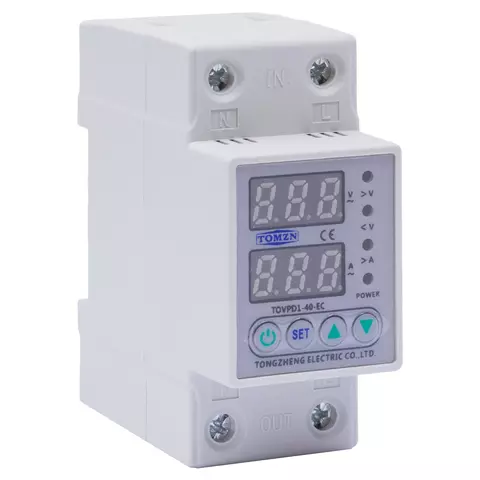Реле напруги TOMZN TOVPD1-40-EC (VA) – пристрій для захисту від перенапруги, зниженої напруги та перевантаження по струму типу TOMZN TOVPD1-40-EC, що вимірює однофазну дводротову активну енергію змінного струму. При перевищенні попередньо встановлених значень, пристрій вимикає струм, а при поверненні значень у допустимий діапазон автоматично під’єднує його.