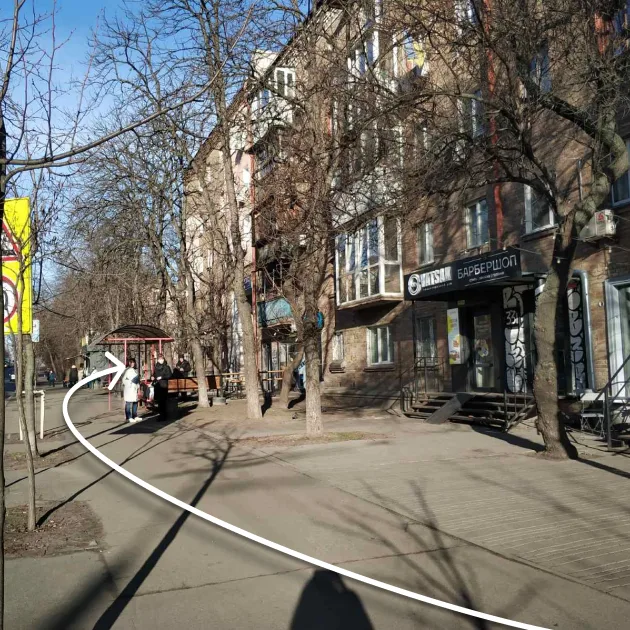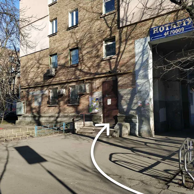 Вхід в наш офіс — біля тролейбусної зупинки (коричневі металеві двері ліворуч від арки). Біля входу окремо виведений домофон, а офіс знаходиться на першому поверсі.