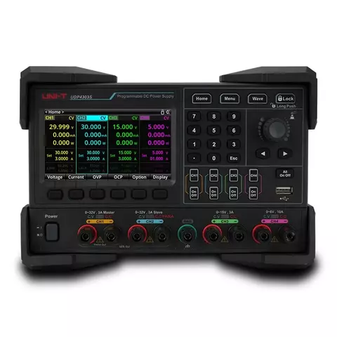 UNI-T UDP4303S – програмоване лінійне джерело живлення постійного струму з двома каналами 32 В/3 А, одним 15 В/3 А та ще одним 6 В/10 А. Забезпечує низьку регуляцію навантаження і низький рівень пульсацій, при цьому кожен канал ізольований від інших. Усі чотири канали підтримують функцію дистанційного вимірювання (чотирипровідне під'єднання). Канали 1 і 2 підтримують внутрішнє послідовне та паралельне з'єднання, що робить пристрій універсальним для різних застосувань.