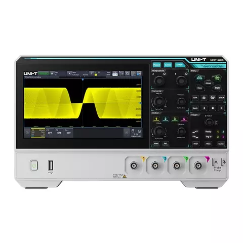 UNI-T UPO1154HD – це чотириканальний цифровий осцилограф з високою роздільною здатністю, смугою пропускання 150 МГц, максимальною частотою дискретизації 1,25 Гвиб/с та глибиною пам'яті до 100 МБ. Осцилографи серії UPO1000HD використовують фірмову технологію відображення UltraPhosphor 3.0, що забезпечує швидкість захоплення осцилограм до 500 000 форм/с та 256 рівнів градацій сірого. Прилад оснащений цифровою системою запуску з високою чутливістю та низьким джитером.