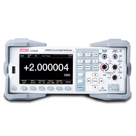 UNI-T UT8806EG – це настільний цифровий мультиметр з роздільністю 6½ розрядів і максимальною кількістю відліків 2 000 000. Прилад вирізняється високою точністю, багатофункціональністю та повною автоматизованістю. UT8806EG оснащений 4,3-дюймовим TFT-дисплеєм з роздільною здатністю 480×272, підтримує інтерфейси LAN, USB, RS-232C і GPIB, що робить його придатним для високоточних вимірювань у лабораторіях і автоматизованих тестових системах.